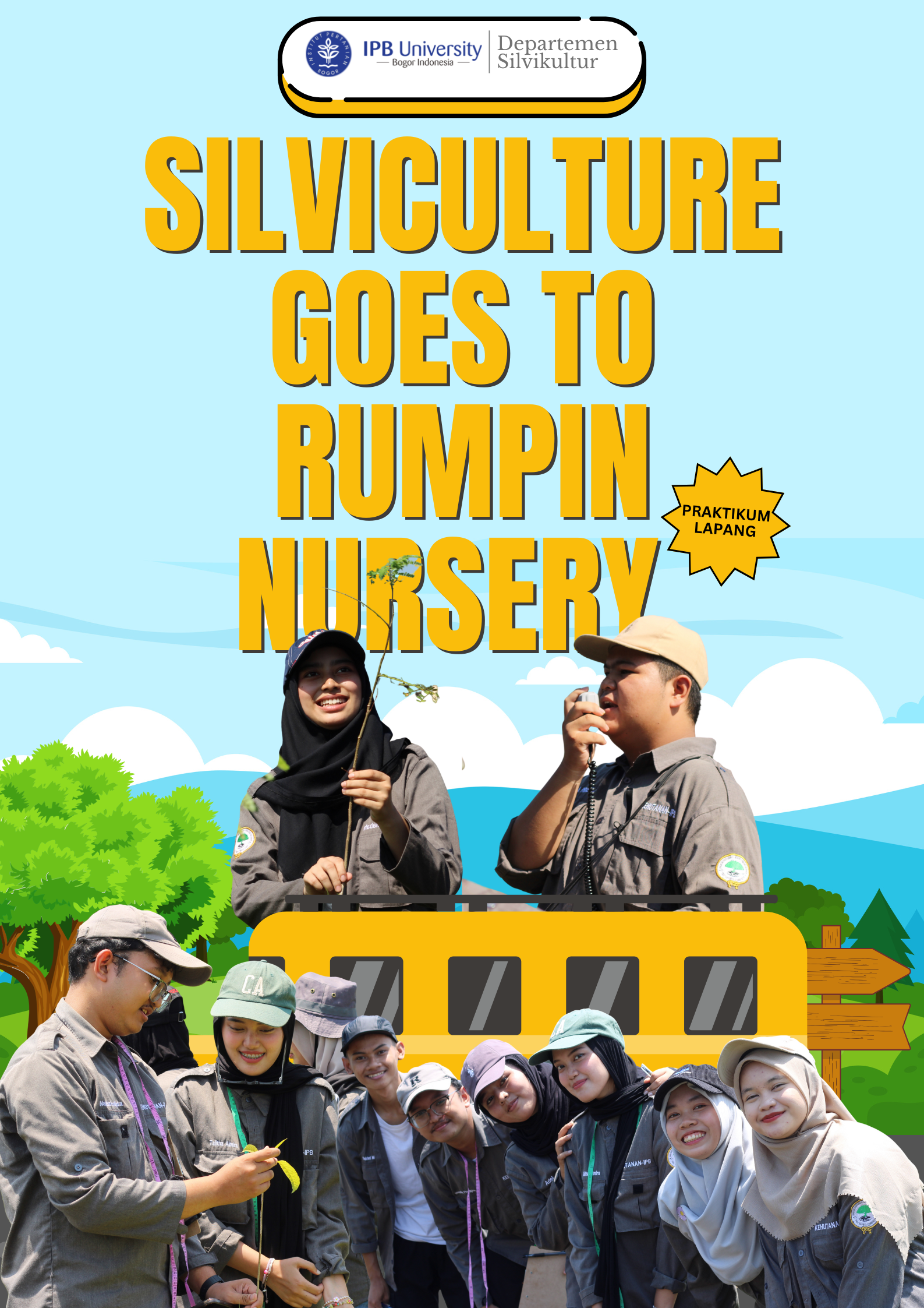 Bogor, 4 Oktober 2025 – Sebanyak 87 mahasiswa Departemen Silvikultur, Fakultas Kehutanan dan Lingkungan IPB University, mengikuti kegiatan Praktikum Lapang Mata Kuliah Teknologi Perbenihan Tanaman Hutan (SVK1328) dan Mata Kuliah Patologi Hutan (SVK1336) yang diselenggarakan di Persemaian Rumpin, Bogor. Kegiatan berlangsung pada Sabtu (4/10) mulai pukul 09.00 hingga 12.00 WIB, dengan didampingi 3 dosen pengampu, 1 teknisi laboratorium, serta 15 asisten praktikum.