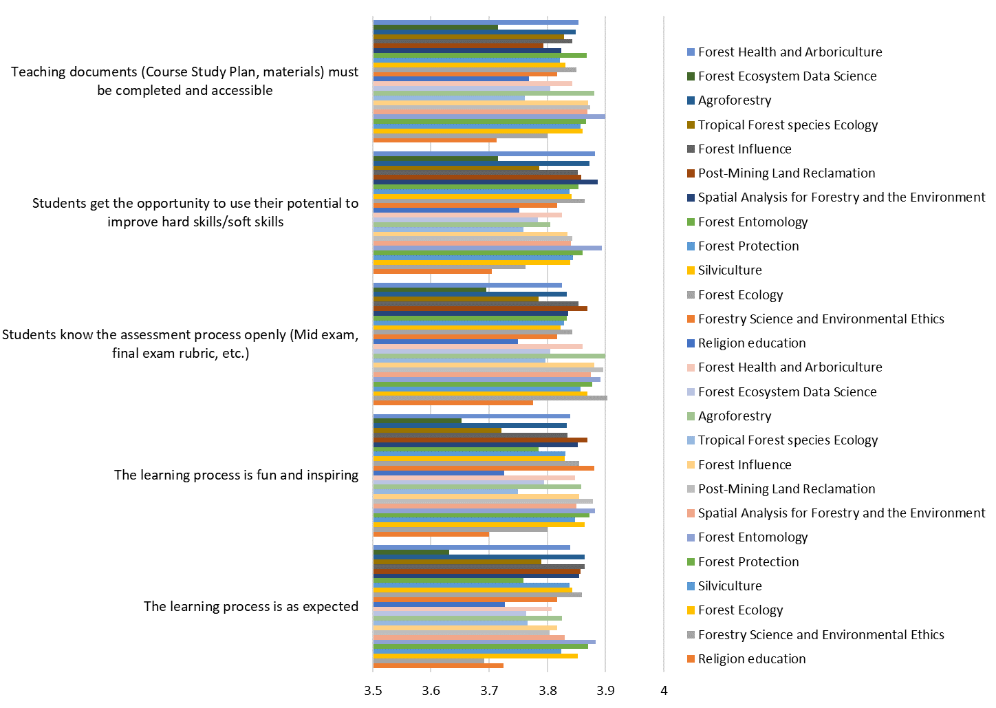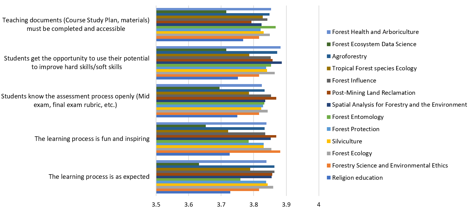 EPBM recapitulation results in the academic year of 2023/2024, there are 13 courses given by the Silviculture Study Program and taught by lecturers in the Silviculture Study Program. The results of this EPBM recapitulation are feedback from students regarding the evaluation of teaching and learning activities in each course. The recapitulation results of the EPBM assessment for courses evaluation offered in the 2023/2024 academic year have an overall average score of 3.82 out of a total score of 4.00, so it can be concluded that all courses taught by the Silviculture Study Program in the 2023/2024 academic year meet expectations and expectations of students who take these courses. The highest assessment in course evaluation is in the aspect of students getting the opportunity to use their potential in improving their hard skills/soft skills, which is 3.83 out of a total score of 4.00. Another aspect of course evaluation has a score that is not much different, namely in the range of 3.81-3.82 from a total score of 4.00. EPBM details for course evaluation in the Silviculture Study Program for the 2023/2024 academic year are presented in Figure 1.