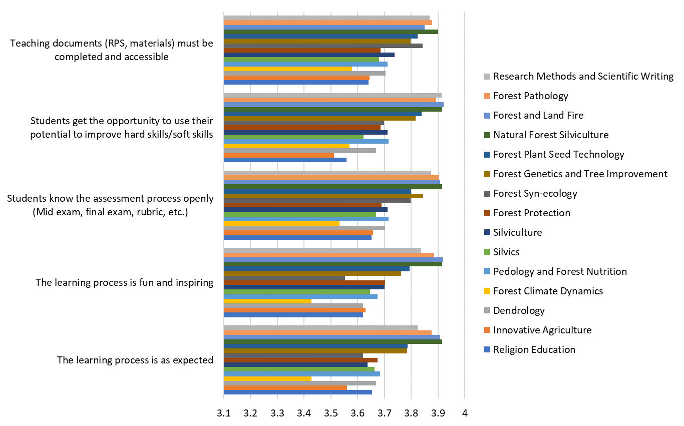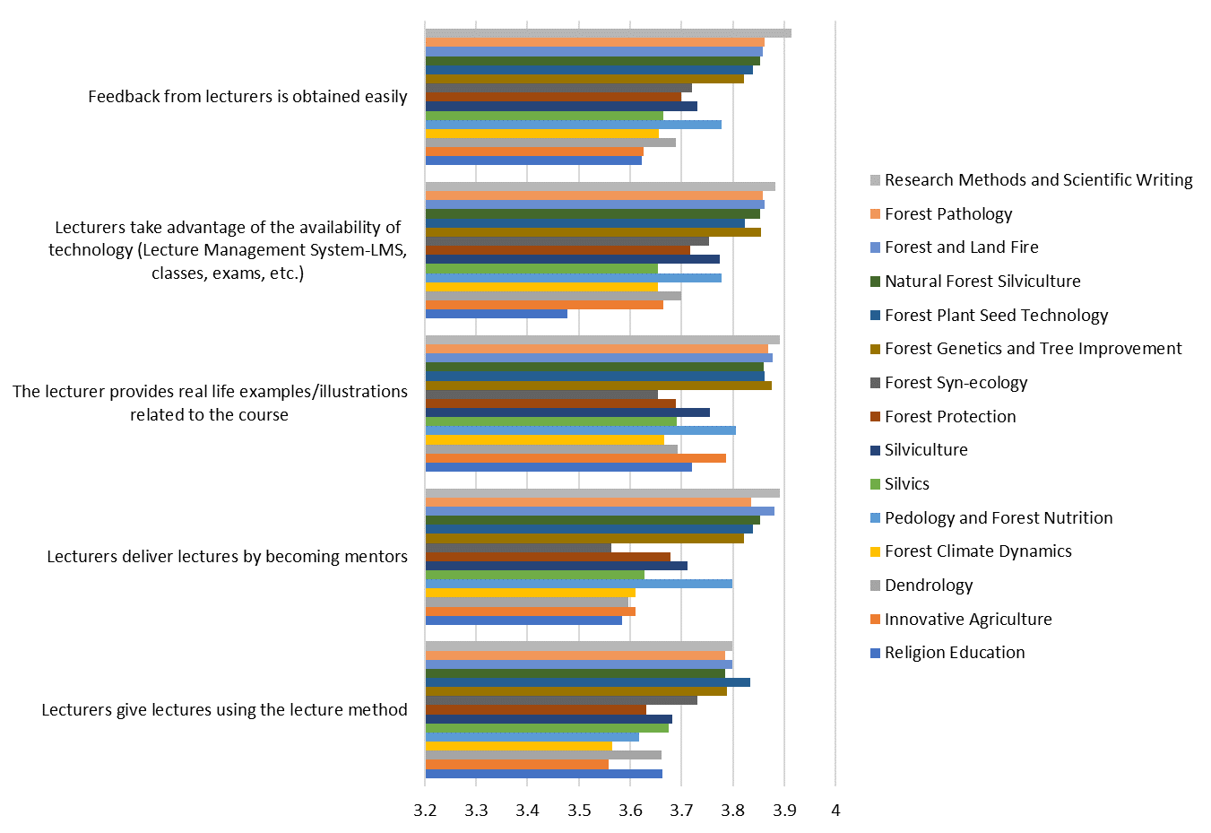 The recapitulation results of the EPBM assessment for lecturers that teaching courses offered in the 2024/2025 academic year have an overall average score of 3.74 out of a total score of 4.00 from a total of 25 lecturers. The highest score is seen in the aspect of lecturers providing examples/illustrations in real life related to the subjects taught with a score of 3.78 out of a total score of 4.00 and for other aspects in the evaluation of lecturers who teach courses, the scores are not much different, namely in the range of 3, 70-3.76 out of a total score of 4.00. Details of the EPBM for the evaluation of lecturers that teaching courses in the Silviculture Study Program for the 2024/2025 academic year are presented in Figure 2.